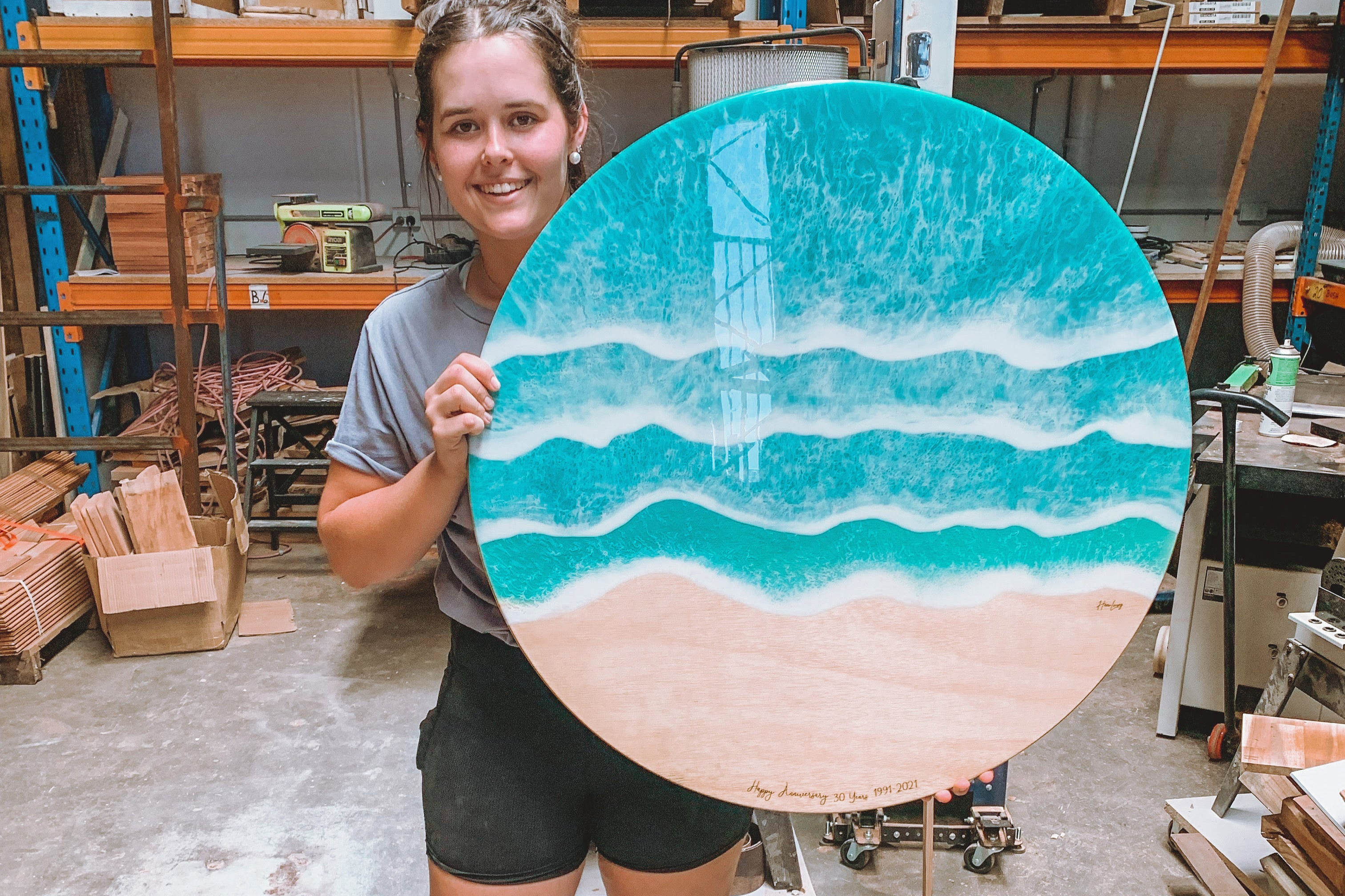 Our resin artwork is not limited to just platters and homewares. We understand that every space is unique, and that's why we offer custom size artwork to suit your specific needs and preferences. Whether you're looking for a statement piece for your living room, a vibrant artwork for your office, or a personalized gift for a loved one, Lucy can bring your vision to life.